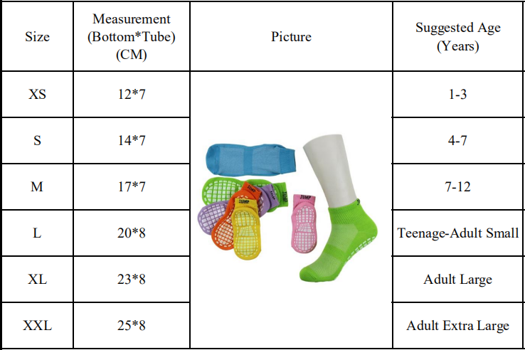 Trampoline socks : It's made of polyester, spandex and elastic. The advantage of these non-slip socks is that they last longer than cotton ones, and also, that they come “one-size-fits- all” models. This feature is particularly practical for trampoline centers that attract people of all sizes and ages.
